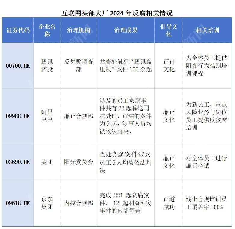 频年来,互联网大厂反腐行动愈发长远。《逐日经济新闻》记者中式了互联网头部大厂——腾讯控股(00700.HK)、阿里巴巴(09988.HK)、好意思团(03690.HK)和京东集团(09618.HK)的2024年度ESG联系陈说进行不雅察。记者发现,这些公司多量从轨制、文化开导及培训上进行反恶臭,并公布了相应效果。