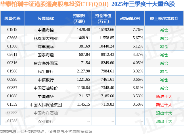 从基金范围来看,华泰柏瑞中证港股通高股息投资ETF(QDII)基金2025年三季度公布的基金范围为20.37亿元,较上一期范围26.98亿元变化了-6.61亿元,环比变化了-24.51%。该基金最新一期钞票配置为:股票占净值比98.05%,无债券类钞票,现款占净值比0.95%。从基金持仓来看,该基金当季前十大股票仓位达45.19%,第一大重仓股为中远海控(01919),持仓占比为7.76%。